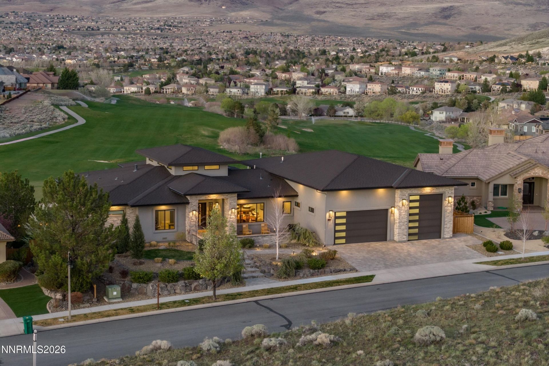 Life feels a little bigger here. Located in the Wingfield Springs area backing to the fairway at Red Hawk Golf and Resort, this spacious and thoughtfully designed home offers the kind of flexibility and functionality that is rarely available. Built in 2019 and spanning nearly 4,750 square feet, the layout is both comfortable and practical with five bedrooms, four full bathrooms, and main living areas positioned on the primary level for everyday ease. Large windows frame open golf course views while high ceilings and European white oak flooring create an inviting sense of scale throughout the home. The kitchen was designed to be used and enjoyed, featuring premium appliances, abundant cabinetry, and a seamless connection to the great room and dining space. Whether hosting friends or enjoying a quiet evening in, the flow of the home supports both lively gatherings and relaxed day-to-day living. Downstairs, an additional living area with its own kitchenette and bar opens the door for multi-generational living, long-term guests, or a private entertainment zone. For those who need real garage space, this property truly delivers. The heated garage offers the ability to accommodate up to ten vehicles, or configure the space for RV parking along with multiple cars, toys, or workshop needs. Offering a mezzanine area, and additional storage below, it is a setup that car enthusiasts, hobbyists, and adventure-seekers will immediately appreciate. Situated on a generous .36-acre homesite with mature landscaping and irrigation, the backyard provides a peaceful setting to take in golf course views, mountain backdrops, and Northern Nevada sunsets. Convenient access to shopping, dining, recreation, and commuter routes adds to the overall lifestyle appeal of this well- rounded property.