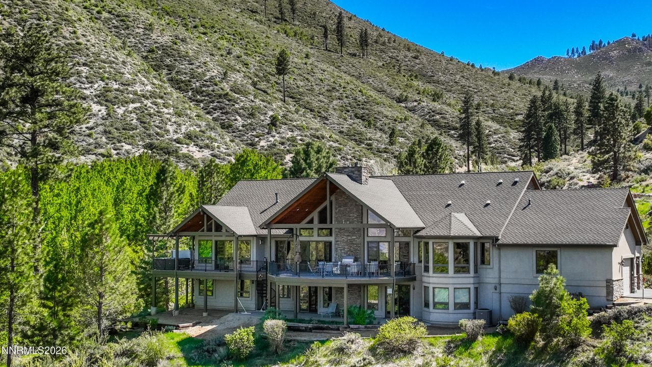 Renewed, refreshed, and ready to move in-this exceptional Washoe Valley property is defined by its setting and sweeping views across the valley and Washoe Lake. Situated on five acres at the south end of the valley, the property offers a rare sense of openness and privacy, with convenient access to Carson City and just minutes from Toiyabe Golf Club. A stand of old growth aspens borders the eastern edge, where a year-round creek creates a serene natural backdrop. Tucked within the trees, a Quonset hut offers additional, discreet storage. Inside, natural materials and thoughtful updates define the mountain modern home, including knotty alder cabinetry, travertine and slate flooring, and newly refinished Brazilian cherry hardwood with a modern finish. The kitchen has been updated with new granite and is well-equipped with a Sub-Zero refrigerator and freezer, six-burner gas range with pot filler, and three dishwashers-designed for both daily living and larger-scale entertaining. Three gas fireplaces add warmth and ambiance throughout. The home is designed for comfort and efficiency with natural gas forced air heat, electronic air cleaners, two upstairs air conditioning units, two 75-gallon water heaters, and a backup generator. The lower level is accessible by elevator and offers flexible living for guests, in-laws, or live-in assistance, with a spacious guest suite, additional bedroom, kitchenette, game room, and a versatile bonus space or fifth bedroom. An oversized attached two-car garage includes a dog wash station. The detached garage expands the property's versatility with heated bays, an office or living space with full bath and tankless water heater, a workshop with pass-through doors, and a second bay accommodating a 43-foot RV-also with pass-through access. Enjoy the mountain, valley and lake views from every room and the spacious covered deck!